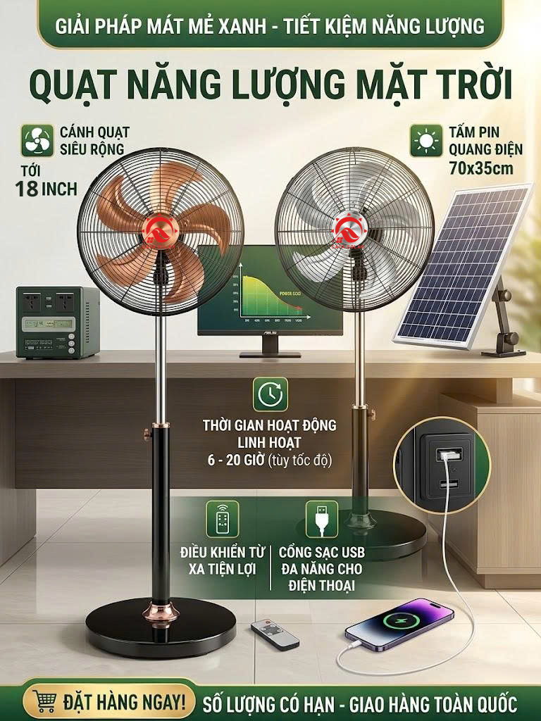 Kết luận: Quạt đứng công nghiệp 18 inch năng lượng mặt trời với tấm pin Mono 70x35cm là sự đầu tư xứng đáng cho cả gia đình và doanh nghiệp. Hãy để công nghệ xanh chăm sóc sức khỏe và túi tiền của bạn ngay hôm nay!