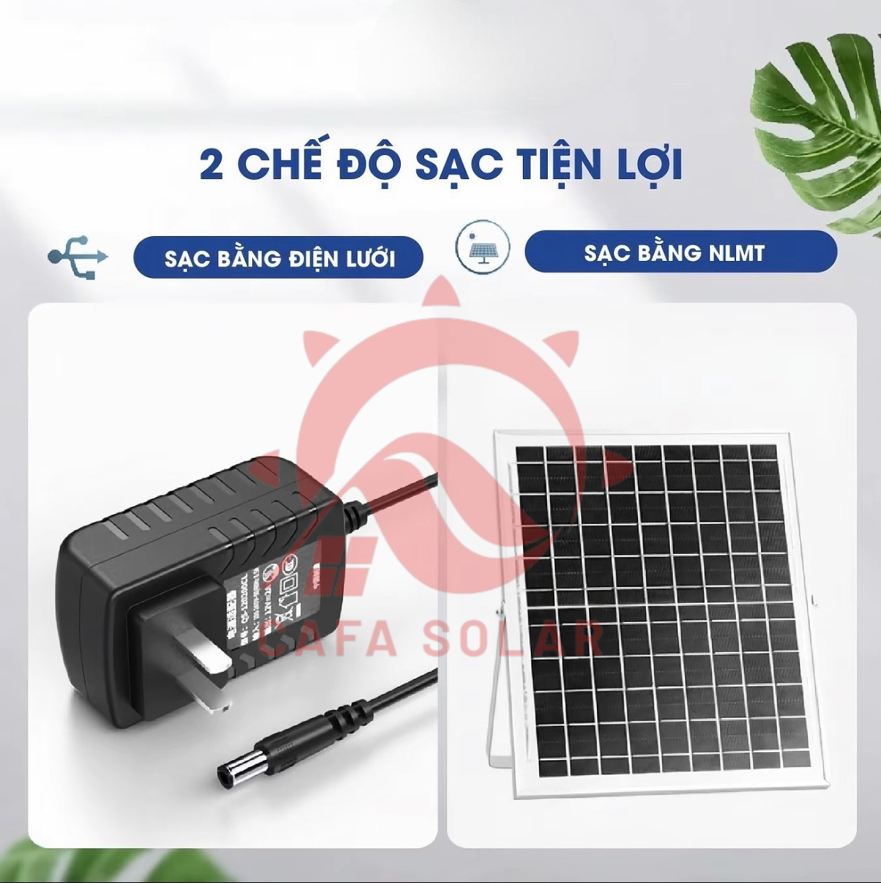Chế độ sạc bằng năng lượng mặt trời: Tự động sạc qua tấm pin 70x35cm khi có ánh nắng mặt trời.